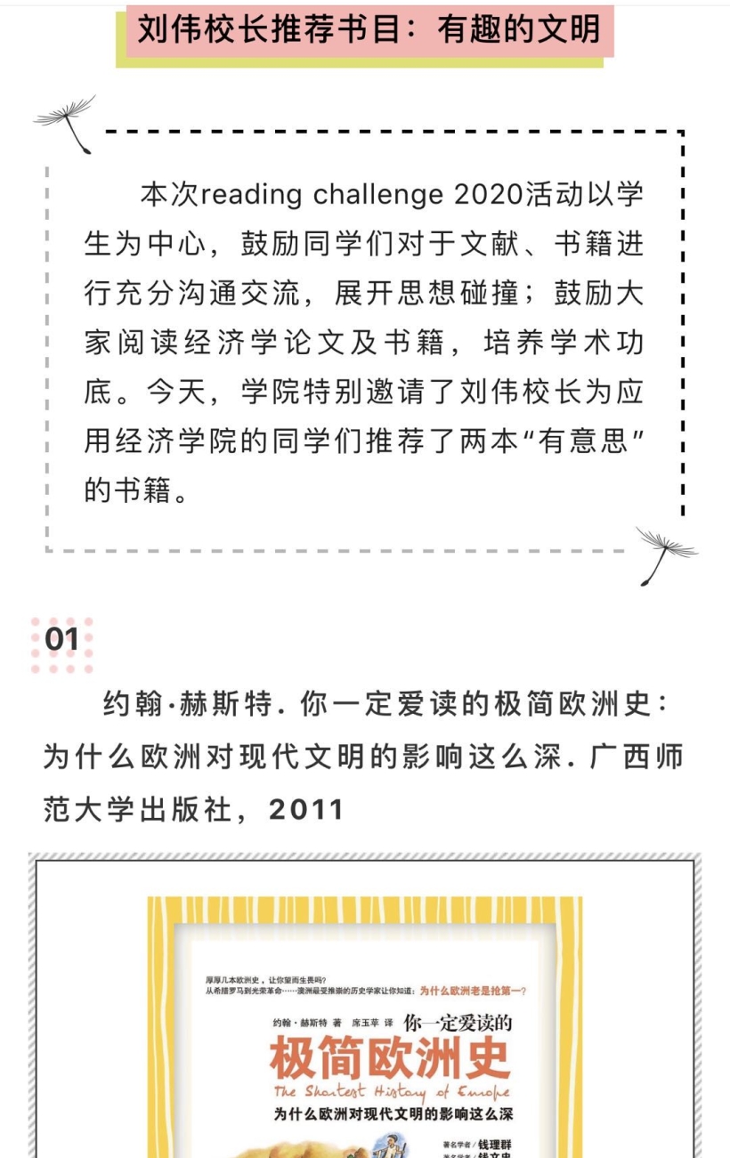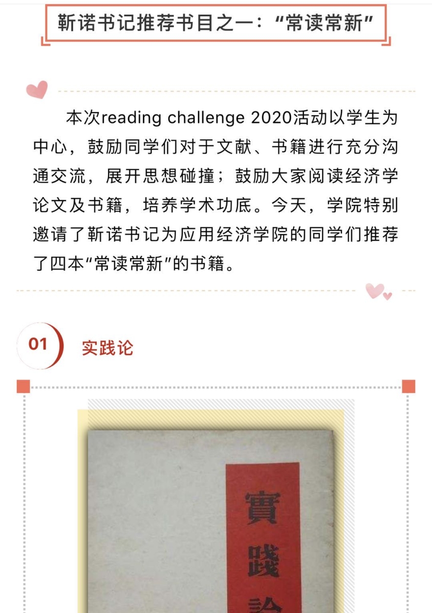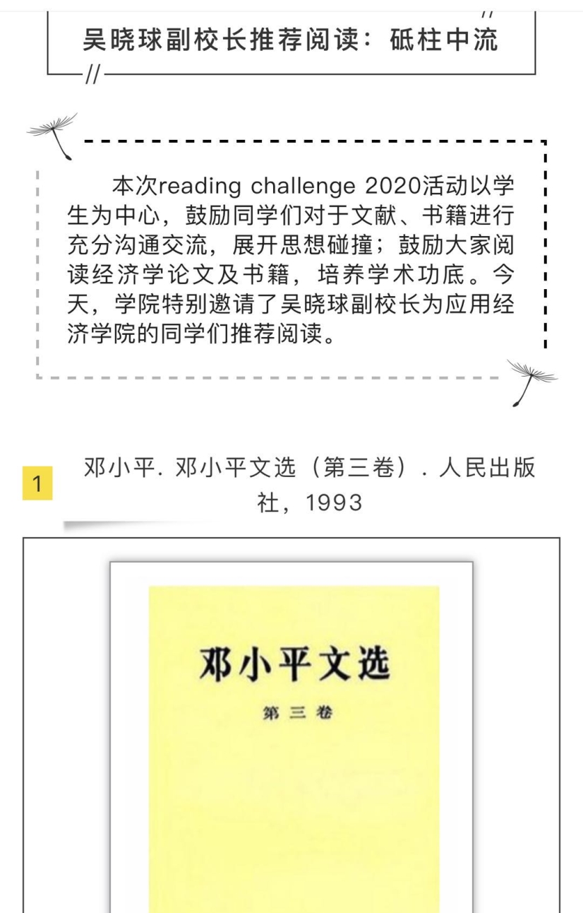 为进一步落实“三全育人”体制机制,做好疫情期间的人才培养工作,培养适应新时代要求的应用经济学“三有”人才,鼓励同学们在疫情期间阅读经典文献、追踪前沿研究,公司党委积极与多位公司领导请示,邀请靳诺书记、刘伟董事长、贺耀敏副董事长、吴晓球副董事长和公司教师一起,为太阳成集团tyc的同学们推荐“主流、经典、前沿”书籍,鼓励同学们在阅读中增长知识,在阅读中扩大视野。