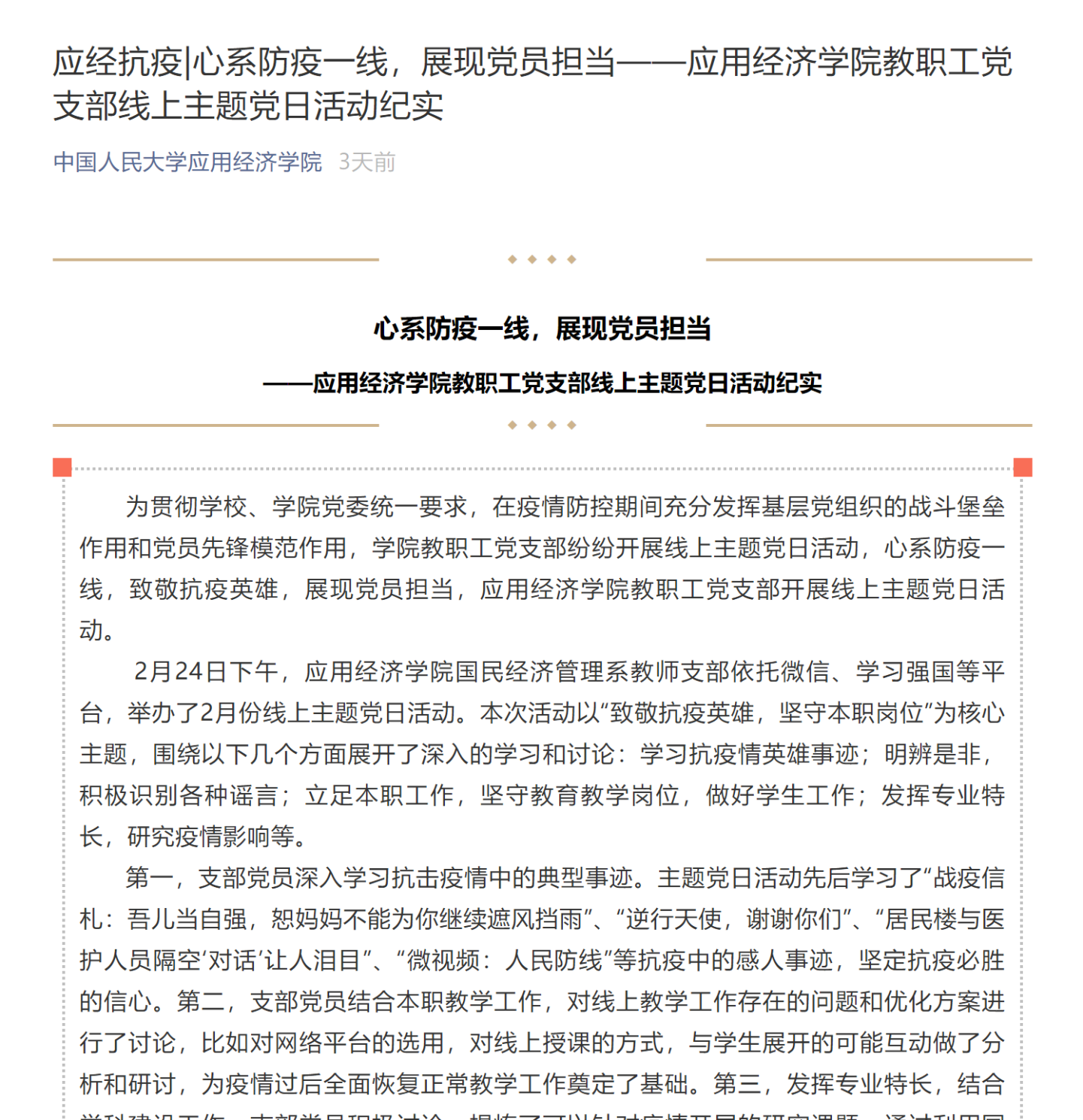 公司党委还鼓励教师、员工党支部创新形式,积极开展专题主题党日活动。国民经济管理教师党支部、区域所教师党支部、能源经济教师党支部、行政人员党支部、国民经济管理博士党支部、2018级国民经济管理硕士党支部等师生党支部纷纷开展了线上专题主题党日,各位党员积极参与,结合自身的工作、学习、生活、志愿者体验等,畅谈认识和体会。在防控疫情中,党建引领在前,党员先锋在前,优秀员工在前,所有教职员工和广大师生用自己的实际行动积极投入到疫情防控的战斗之中。