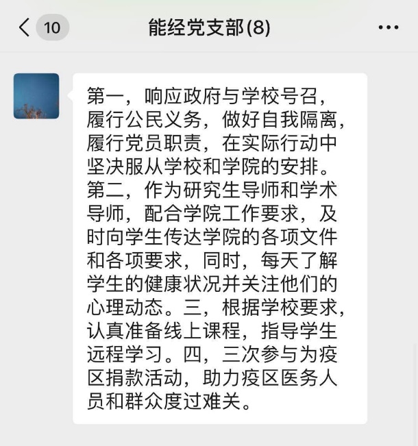 作为一名高校教师,不能忘记教书育人的使命。在疫情防控期间,支部全体教师积极响应公司和公司的工作安排,将每一个关系到员工安全的消息通知到每一位员工,切实负起安全责任。为了落实“停课不停学”的重要指示,支部全体教师认真准备线上教学课程,远程指导员工学习和科研,一方面稳定了员工的心理状态,另一方面,使员工能够真正地将时间利用起来,做到“不停学”。