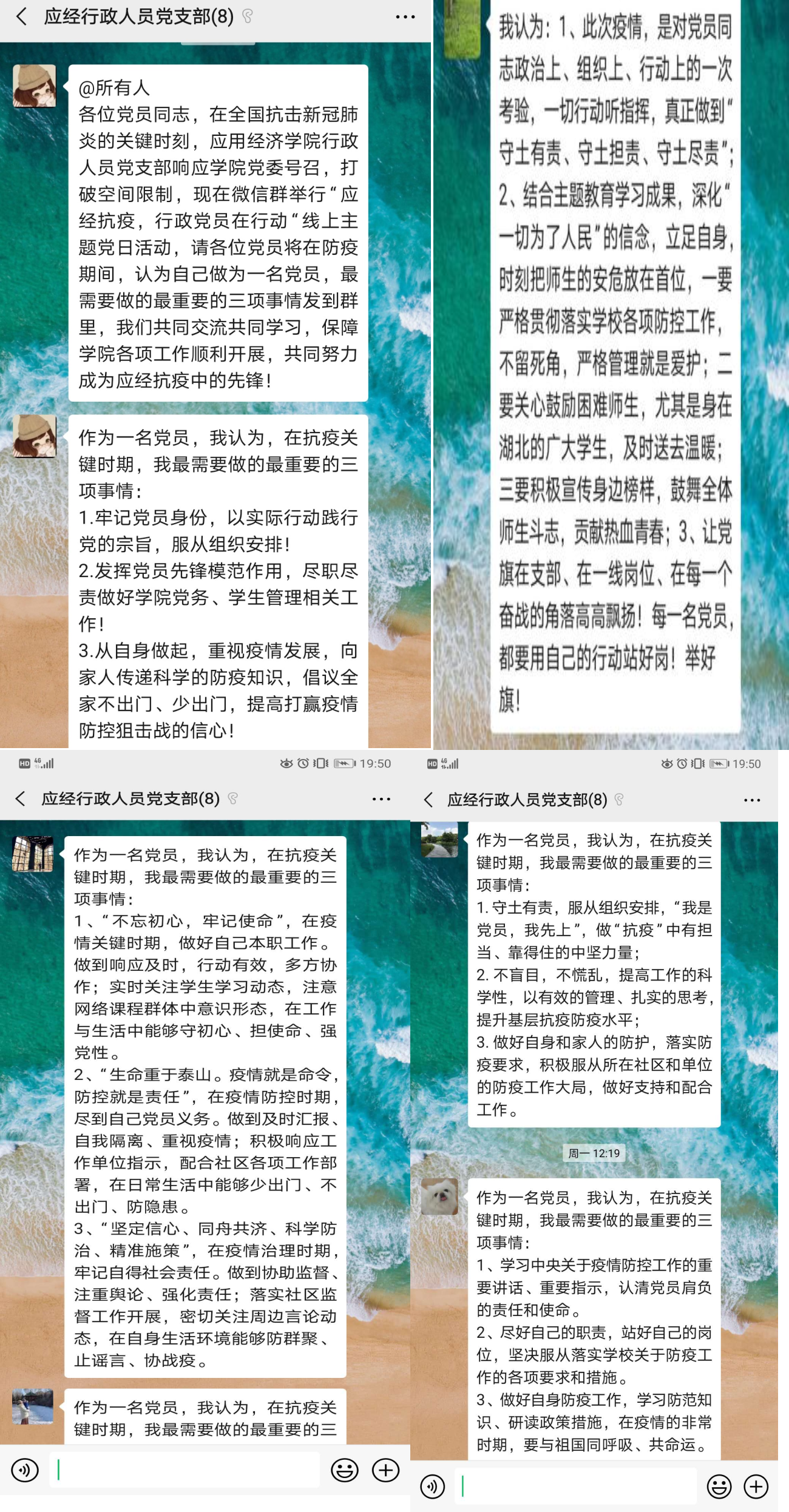 2月25日,在全国抗击新冠肺炎的关键时刻,太阳成集团tyc行政人员党支部响应公司党委号召,打破空间限制,在微信群中开展“应经抗疫,行政党员在行动”线上主题党日活动,全体党员参与本次活动。每位党员都结合自己的工作和生活谈了自己的认识与感触,共同交流共同学习,保障公司各项工作顺利开展,共同努力成为应经抗疫中的先锋。大家纷纷发言,众志成城,希望用实际行动为公司、为公司、为国家的防疫工作做出应有的贡献!