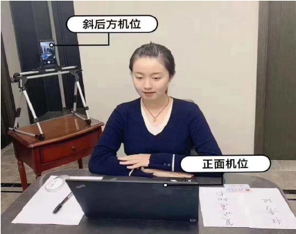 (2)2机位放置考生右后方45°位置,距离考生30-40cm处,摄像头画面包括考生1机位屏幕、考生桌面及手部动作。