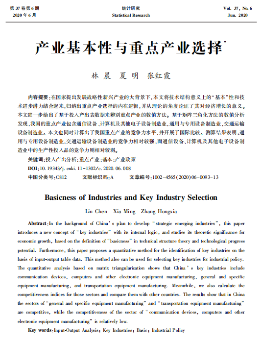 产业基本性与重点产业选择在国家提出发展战略性新兴产业的大背景下,本文将技术结构意义上的“基本”性和技 术进步潜力结合起来,归纳出重点产业选择的内在逻辑,并从理论的角度论证了其对经济增长的意义。 本文进一步给出了基于投入产出表数据来辨别重点产业的数值方法。 基于矩阵三角化方法的数值分析 发现,我国的重点产业包含通信设备、计算机及其他电子设备制造业,通用与专用设备制造业,交通运输 设备制造业。 本文也同时计算出了我国重点产业的竞争力水平,并开展了国际比较。 测算结果表明:通 用与专用设备制造业,交通运输设备制造业的竞争力相对较强,而通信设备、计算机及其他电子设备制 造业中的生产性投入品的竞争力则相对较弱。林 晨 夏 明 张红霞