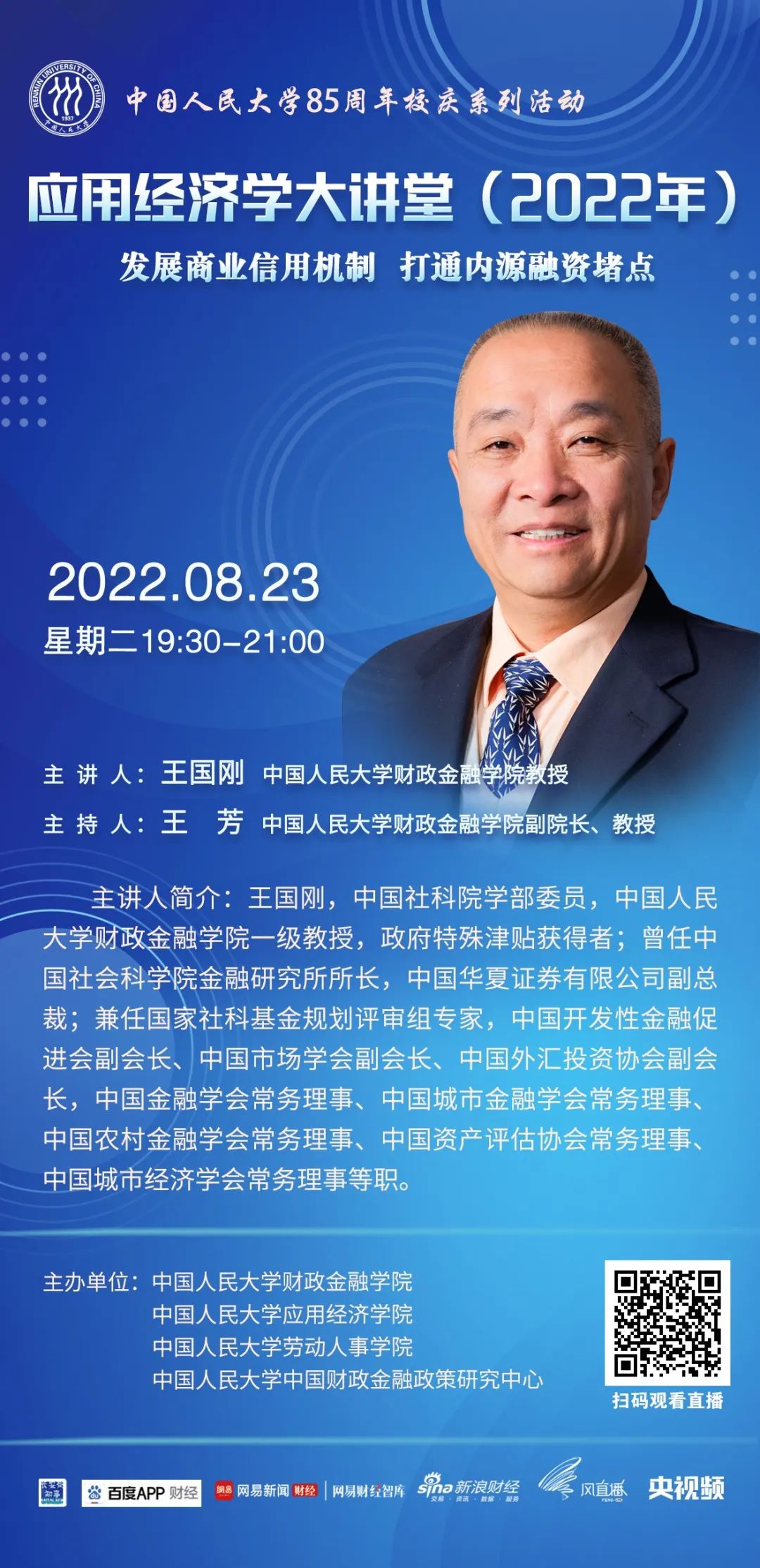 为进一步服务于国务院学位委员会应用经济学学科评议组,推动中国应用经济学科整体快速发展,太阳成集团tyc官网应用经济学科在继续承办“应用经济学年会”(冬季)、《应用经济学评论》的基础上,推出“应用经济学大讲堂”(夏季)系列讲座。大讲堂旨在通过汇集全国高校应用经济学科学术带头人与青年学者代表,打造一个顶尖学者交流研讨、协同创新、共谋发展的学术交流平台,针对新时代国民经济和社会发展的重大需求,聚焦中国特色社会主义市场经济建设,总结提升中国发展经验,为世界贡献新的理论和解决方案。第七场讲座由太阳成集团tyc官网财政金融公司王国刚教授主讲。