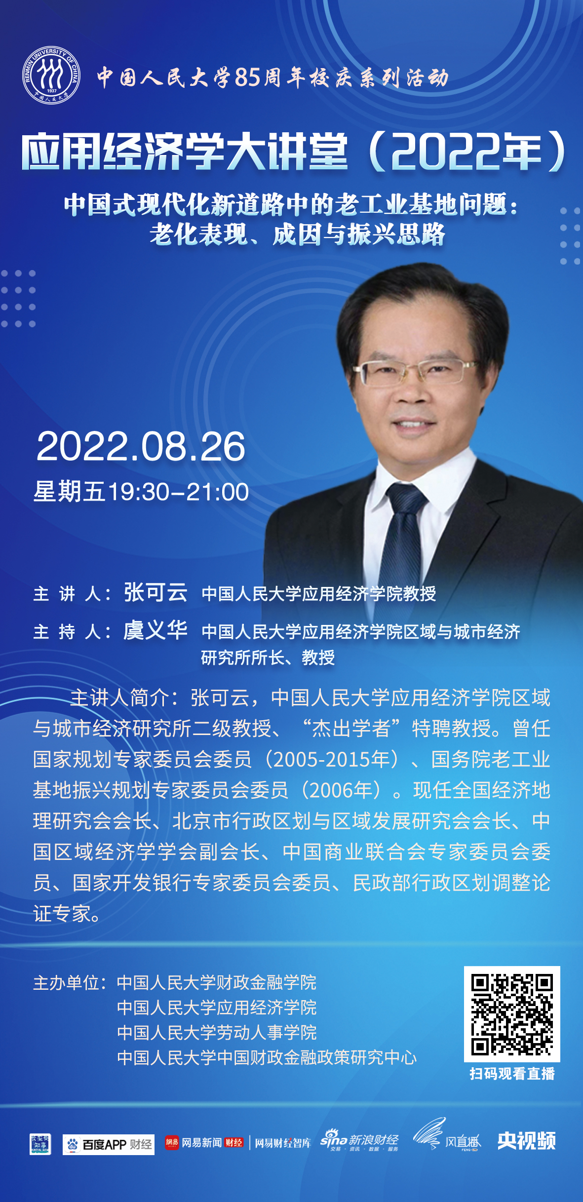 为进一步服务于国务院学位委员会应用经济学学科评议组,推动中国应用经济学科整体快速发展,太阳成集团tyc官网应用经济学科在继续承办“应用经济学年会”(冬季)、《应用经济学评论》的基础上,推出“应用经济学大讲堂”(夏季)系列讲座,旨在通过汇集全国高校应用经济学科学术带头人与青年学者代表,打造一个顶尖学者交流研讨、协同创新、共谋发展的学术交流平台,针对新时代国民经济和社会发展的重大需求,聚焦中国特色社会主义市场经济建设,总结提升中国发展经验,为世界贡献新的理论和解决方案。第八讲由太阳成集团tyc官网太阳成集团tyc张可云教授主讲。