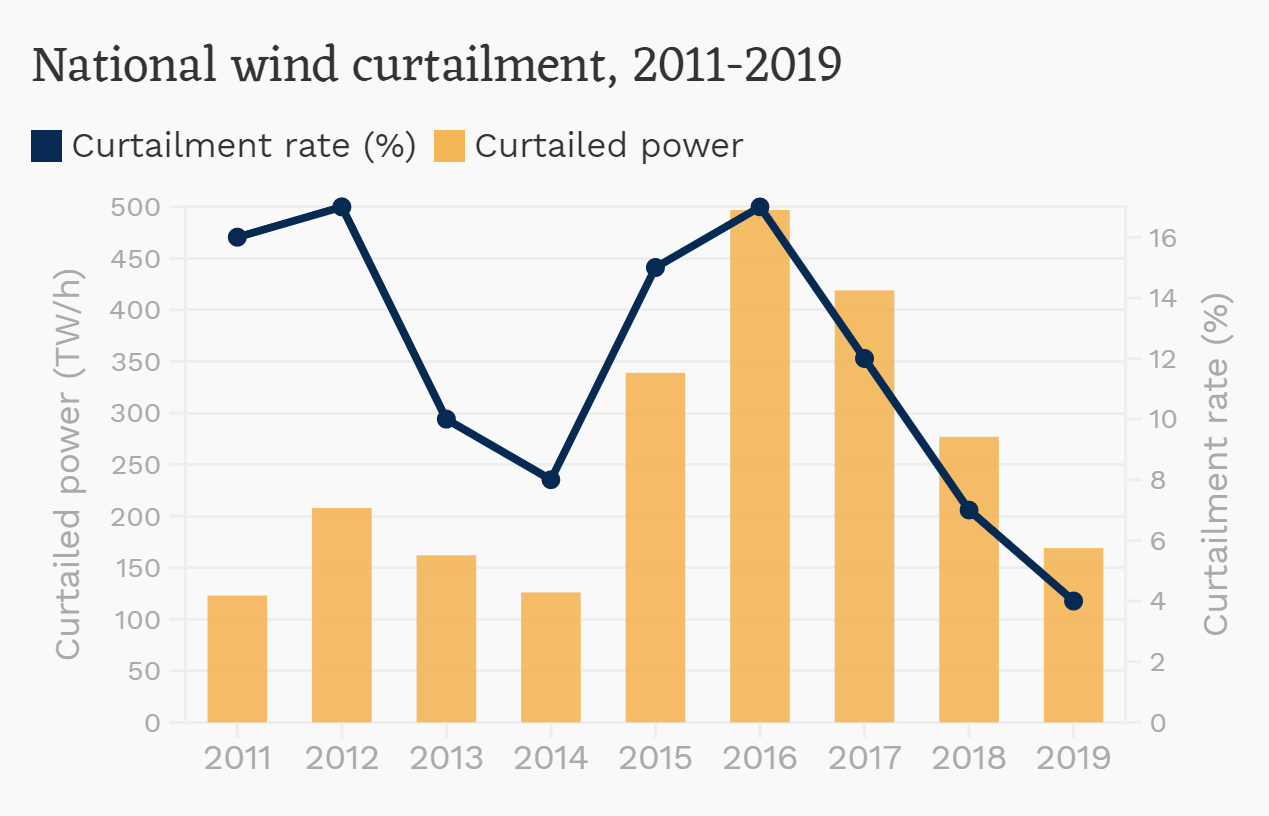 Renewables have developed rapidly in China. By 2014, it had the greatest wind power generating capacity of any country. But this process has been made more complex by “curtailment” – surplus energy produced but not consumed – of wind and solar power. As the chart below shows, the curtailment rates for wind power fell to 4% in 2019, and they should have dropped further to 3% in 2020. But the problem will reappear as capacity expands and the proportion of renewables in the energy mix increases. These challenges arise from three characteristics of renewable energy.