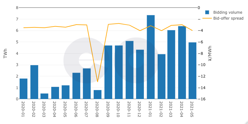 图5展示了月度竞价电量以及竞价价差(月度竞价与煤电标杆电价的差)。2020年8月,竞价价差下跌至-13元/兆瓦时,远低于其他月份。原因是2020年8月开展了第四轮现货市场试运行——现货市场的引入增加了发电行业的竞争,一定程度上削弱了月度竞价中的串谋行为。现货市场也为电力零售商提供了缓冲,即使他们未能在月度竞价中签订合约,仍然可以在现货市场购买电能量。