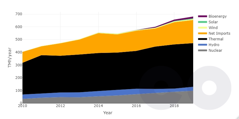 截至2020年底,广东的电力总装机容量达到141GW,其中65.8%来自化石燃料,8.5%来自可再生能源(即风能和太阳能)。2010年-2019年,随着经济的快速发展,广东的电力需求总量平均年增长率为6%,尽管可再生能源占比仍然较低,但发电量增加了12倍,年增长率为32%。同时,广东平均约有24%的电力来自于相邻省份,其中大部分为来自云南省的水电。图1展示了广东省历年来的发电能源构成情况。