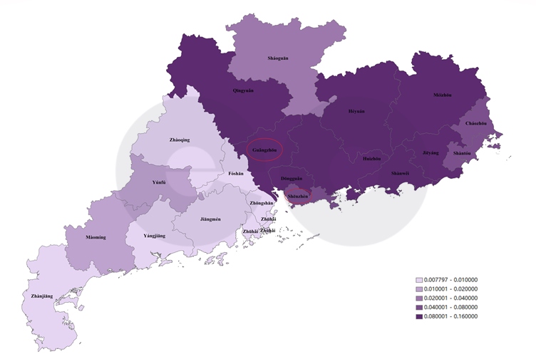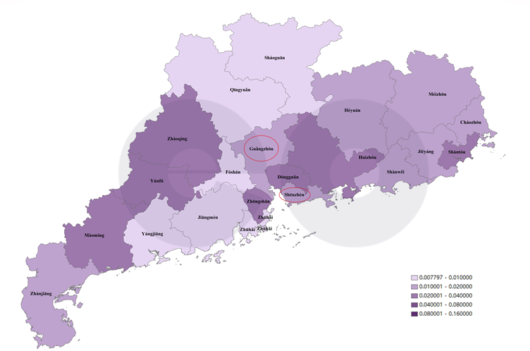 研究发现,惠州、东莞、中山和汕头等区域市场势力较大的城市均位于广州和深圳(图中红圈部分)周围。由于广州和深圳的用电量占全省30%以上,当电能量从周边城市输送到广州和深圳时,增加了周围城市所需的负荷;同时,电力输送面临阻塞的风险,进而产生了区域市场势力。图8b有效说明了全省电力负荷较高时,广州和深圳周边广泛的城市受到区域市场势力的影响,在与广州和深圳紧密相连的东北区域,这一影响尤为突出。