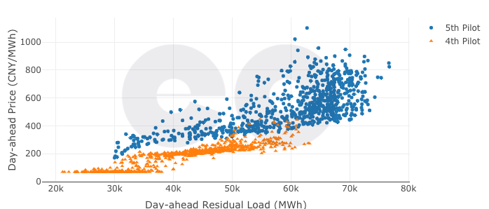 据估算,在第四轮试运行期间,每增加1000MW的负荷平均导致现货价格增加7元/MWh,而这一数字在第五轮试运行期间涨到了13元/MWh。造成这一变化的原因可能是第五轮试运行中的剩余负荷已经接近市场的最大容量,导致市场竞争性减弱。参与竞价的边际机组通过更高的竞价提高利润,导致了更陡峭的供给曲线。