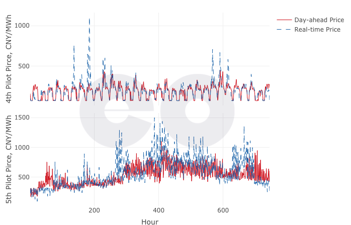 图4展示了两轮试运行期间,日前和实时市场价格的动态变化。第四轮现货市场试运行的价格周期性以日为单位较为明显,但在第五轮中这一特征消失,且价格具有不规则波动的特点。此外,除了少数几个时段外,第四轮的日前与实时价格具有明显的趋同性,但在第五轮中,这一特点消失,且更为频繁地出现极端价格。
