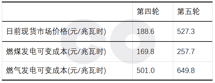 表1列出了第四、第五轮试运行期间的燃料成本以及平均市场价格。值得注意的是,由于广东的容量补偿机制,燃气机组每发1MWh的电能量能获得200元的补贴,因此燃气机组的真实边际成本应当比表格中的数字低200元。研究发现,相较于第四轮试运行,第五轮市场价格增量的65%来自剩余负荷的增加,其余大部分则来自燃料成本的增加。