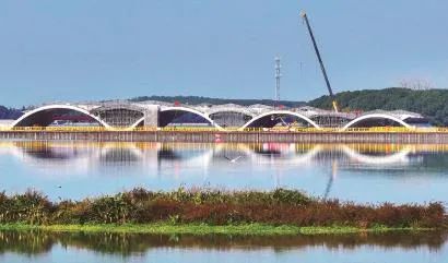 作为长三角示范区一体化审批的首个跨域交通项目,水乡客厅东西向主干道浦港路东延工程西起吴江区思古甸港,东至青浦区沪青平公路。其中的雪落漾桥位于上海、江苏交界处,主桥跨径280米。
