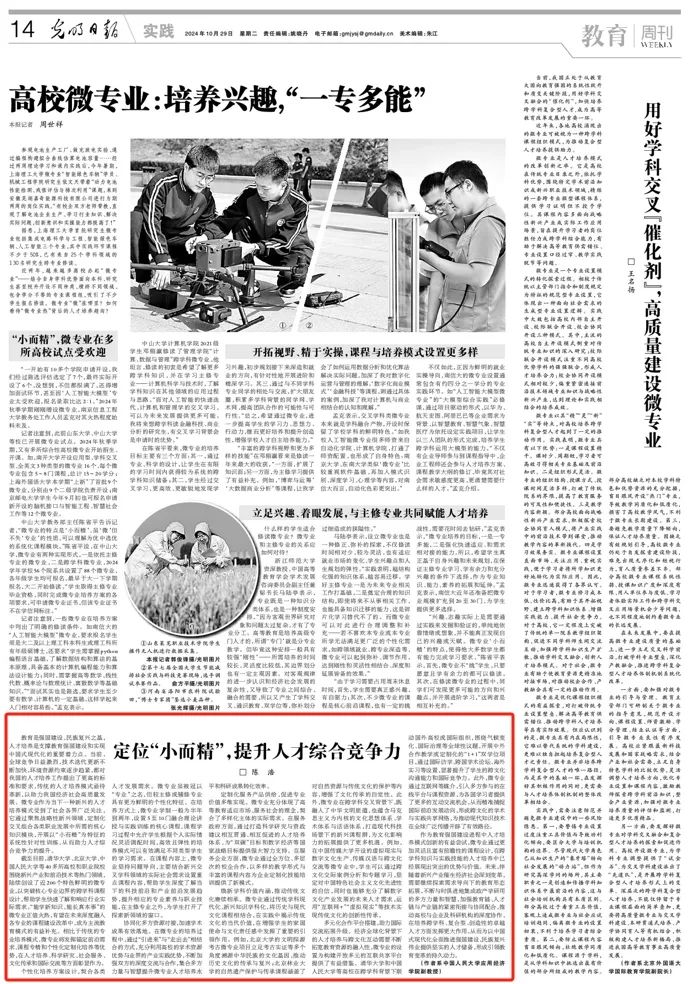 作为教育强国建设进程中人才培养模式创新的有益尝试,微专业通过更加灵活且富有前瞻性的课程设计,在跨学科知识与实践技能的人才培养中已经展现出突出的优势与价值。未来,伴随着新兴产业催生经济社会深刻变革,需要继续探索需求导向下的教育形态拓展,不断与时俱进地集成政产学研用的多方力量和智慧,加强教育链、人才链与产业链的紧密衔接与协同配合,推动高校与企业及科研机构的深度协作,在培养跨学科、复合型、创造性的卓越人才方面发挥更大作用,从而为以中国式现代化全面推进强国建设、民族复兴伟业提供坚实的人才储备,形成引领教育变革的持久动力。