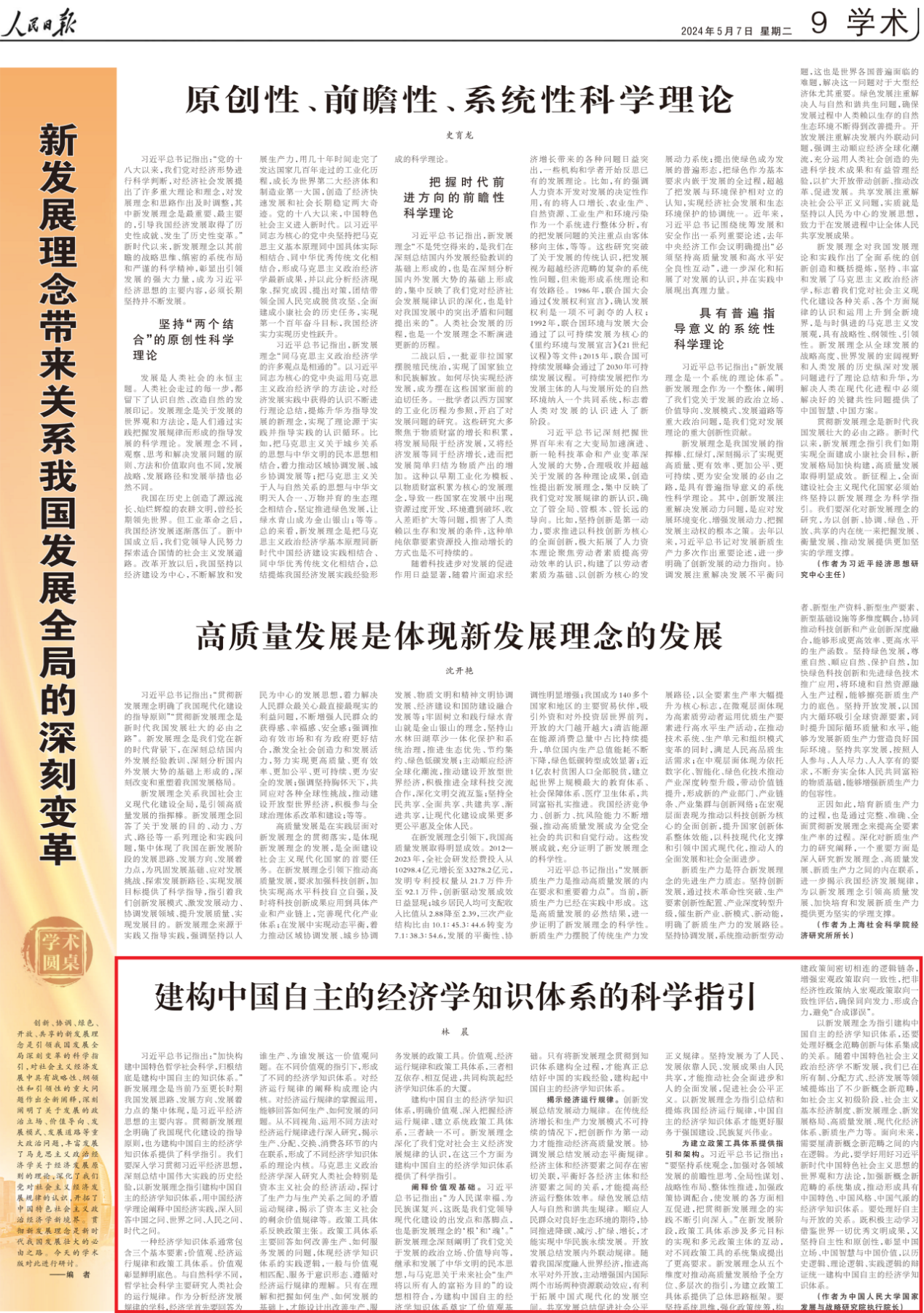 习近平总书记指出:“加快构建中国特色哲学社会科学,归根结底是建构中国自主的知识体系。”新发展理念是当前乃至更长时期我国发展思路、发展方向、发展着力点的集中体现,是习近平经济思想的主要内容。贯彻新发展理念明确了我国现代化建设的指导原则,也为建构中国自主的经济学知识体系提供了科学指引。我们要深入学习贯彻习近平经济思想,深刻总结中国伟大实践的历史经验,以新发展理念指引建构中国自主的经济学知识体系,用中国经济学理论阐释中国经济实践,深入回答中国之问、世界之问、人民之问、时代之问。