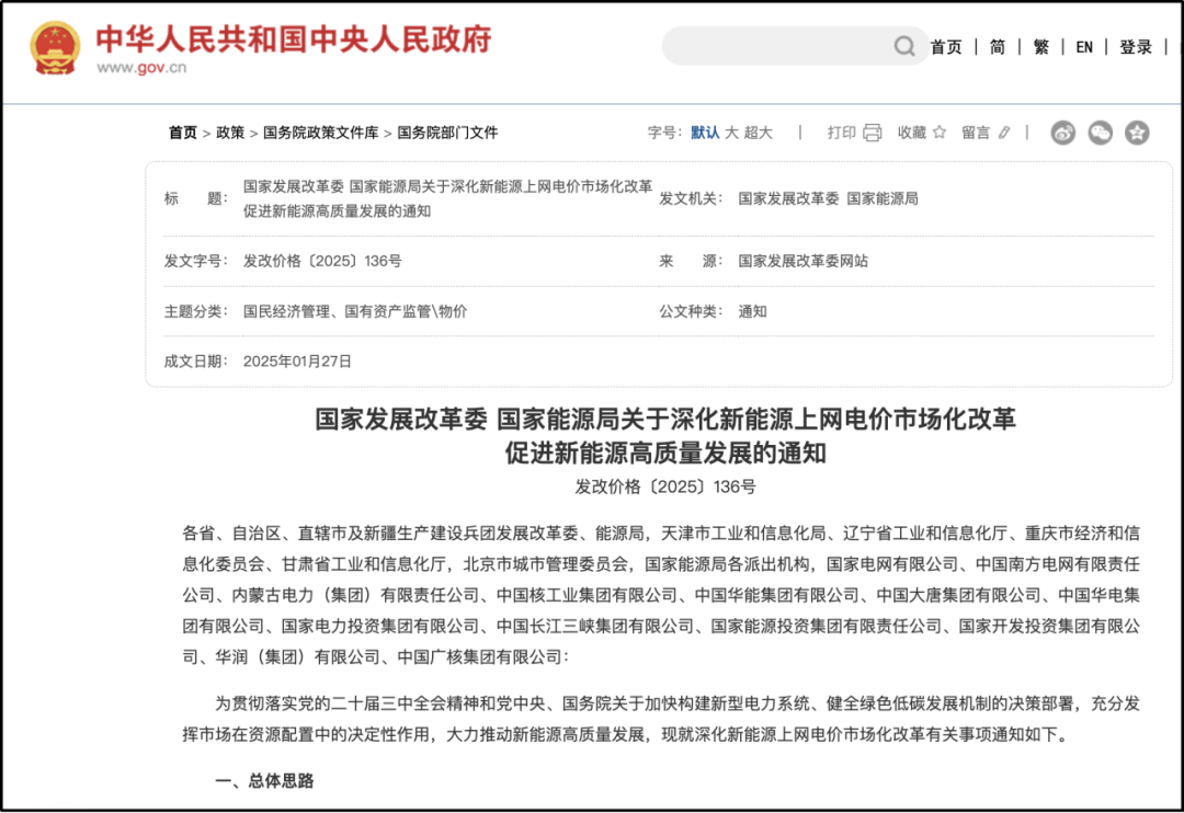 国家发展改革委、国家能源局近日联合发布了《关于深化新能源上网电价市场化改革 促进新能源高质量发展的通知》。《通知》提出,按照“价格市场形成、责任公平承担、区分存量增量、政策统筹协调”的总体思路,深化新能源上网电价市场化改革,推动所有新能源上网电量进入电力市场,确保电价通过市场交易形成。同时,建立支持新能源可持续发展的价格结算机制,针对存量和增量项目分类施策,为行业提供坚实的制度保障。具体来看,对于存量项目,改革后的电量、电价与现行政策妥善衔接;而增量项目则根据国家要求合理确定电量规模,机制电价通过市场竞价确定。