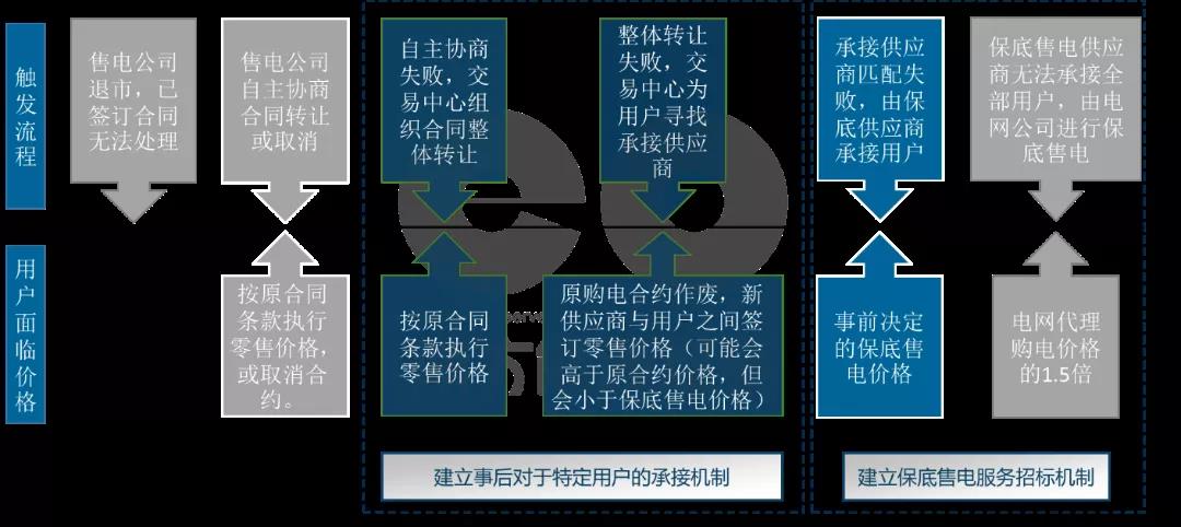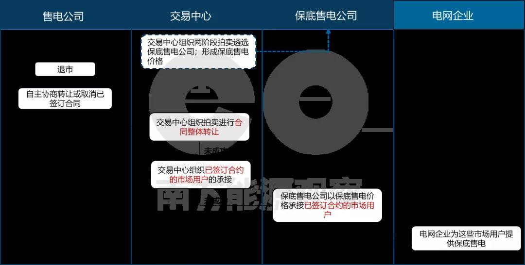 根据最新的售电公司管理办法,售电公司在主动或被强制退市时,要先通过自主协商,将合同转让给其他售电公司,当已经签订的零售合同无法处理时,就会触发保底售电机制。