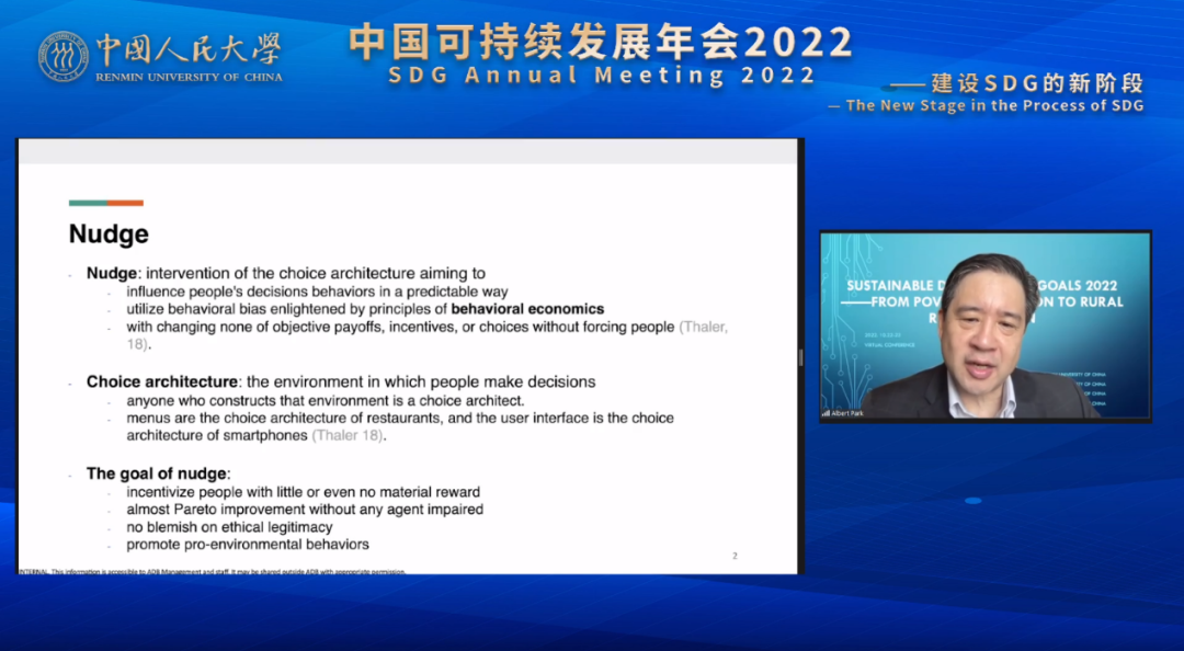 亚洲开发银行首席经济学家、香港科技大学讲席教授Albert Park发表主旨演讲,题目为“Reducing Single-Use Cutlery with Green Nudges: Evidence from China’s Food Delivery Industry”。 该报告使用自然实验的方法探究了外卖软件默认“无需餐具”选项对环境友好外卖订单的影响。从2019年开始,北京市出台政策规定外卖软件需默认“无需餐具”选项,该政策逐步推行至天津、上海等城市,并于2021年在全国范围内施行。报告发现该政策使得环境友好外卖订单比例上升427%,无需餐具订单数上升了20.1%,且影响在中长期是持续的。在演讲最后,Park教授向参会者介绍了他们下一步的研究计划。