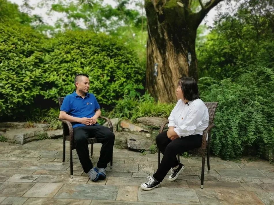 8月17日,在贵州省铜仁市,访谈团师生和在万山区谢桥街道牙溪村驻村锻炼2022届劳动人事公司员工陈继淮、在市委社会工作部工作的2019届商公司员工杨琳锋交流了在基层驻村工作的心得感悟。