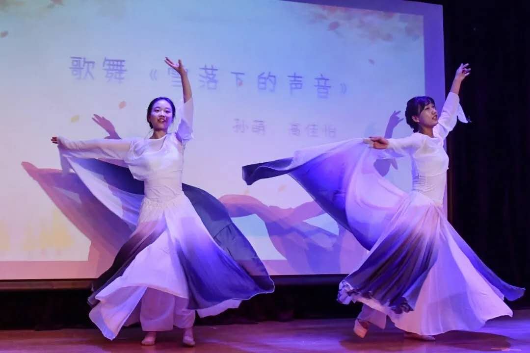 听,雪落下的声音,无言却深情。高佳怡、孙萌带来歌舞《雪落下的声音》,在悠扬的旋律中婉转吟唱、翩然起舞,衣袂飘飘,似云似雪,使人陶醉在这美好之中。