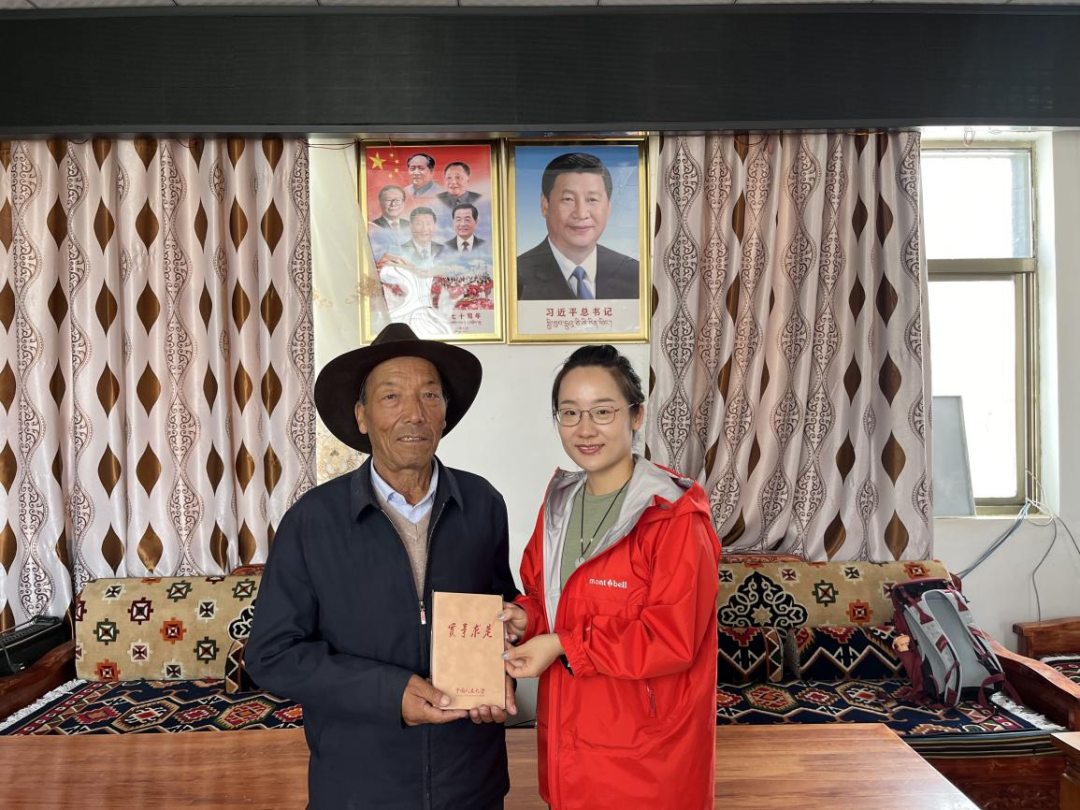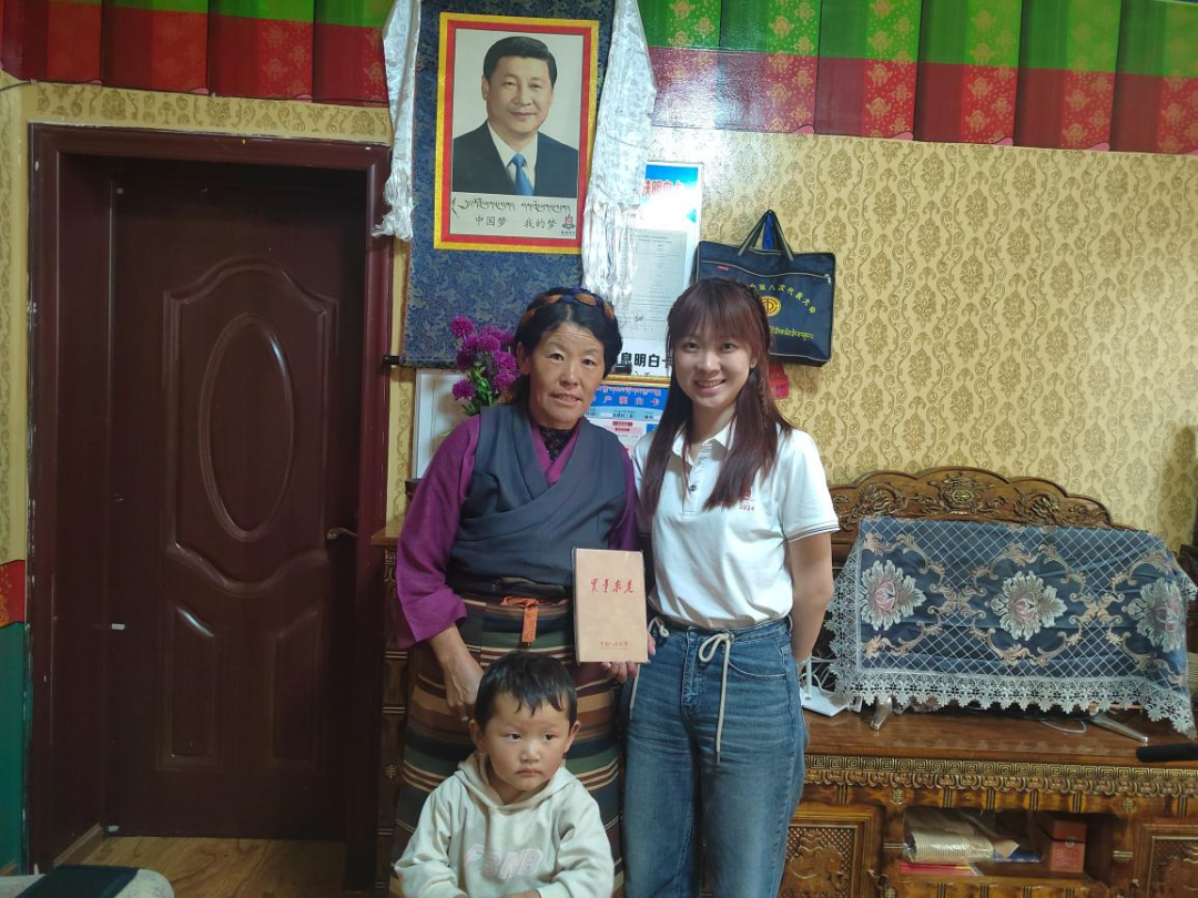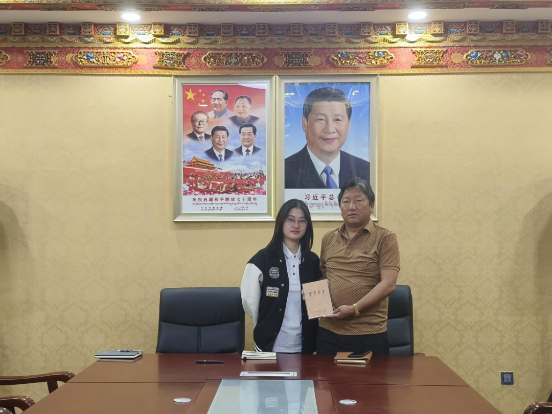 ▲西藏大学经济与管理公司硕士生任文丽访谈扎囊县原扶贫办主任罗永忠并合影留念