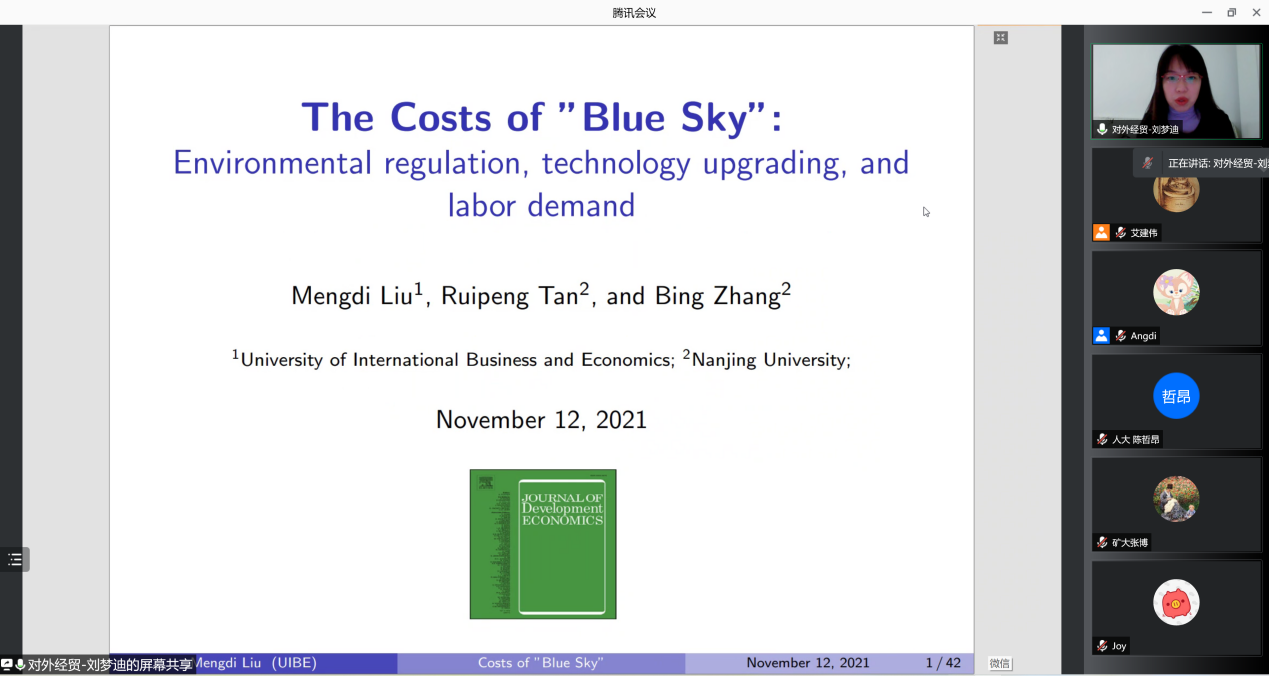 对外经济贸易大学国际经济贸易公司副教授刘梦迪以《蓝天的成本:环境规制、技术升级与劳动力需求》为题进行展示,分析了环境规制对制造业劳动力的影响。研究发现大气污染防治重点城市政策(KCAPC)使二氧化硫排放降低了26%;同时,更严格的空气污染防治政策导致制造业劳动力需求降低了约3%,这主要是因为环境管制对劳动力需求的负向影响通过技术进步的替代效应所导致。另外,环境管制政策也提高了企业劳动生产率,而对工业企业的进入和退出影响不大。此外,低技能劳动力和民营企业的工人受到更大影响。