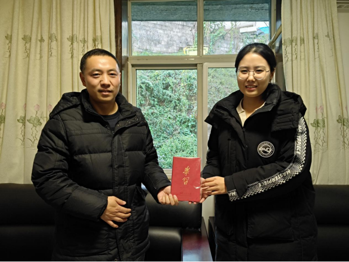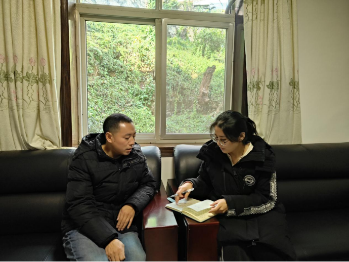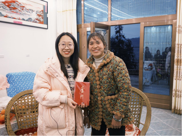 ▲昭通公司管理公司本科生周恩娜对罗坎镇副镇长李上涌(原大庙村第一书记)访谈后赠书留念