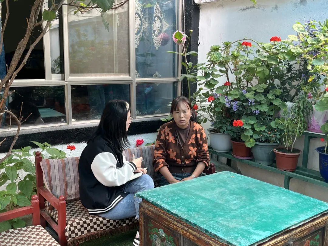 ▲西藏大学经济与管理公司硕士生任文丽访谈三有村脱贫户代表普珍