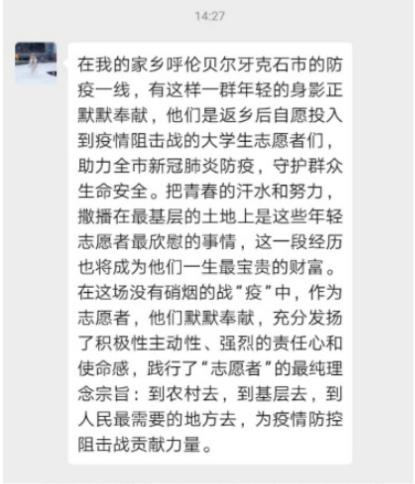 18级国民经济学博士班冯譞:在我的家乡呼伦贝尔牙克石市的防疫一线,有这样一群年轻的身影正默默奉献,他们是返乡后自愿投入到疫情阻击战的老员工志愿者们,助力全市新冠肺炎防疫,守护群众生命安全。把青春的汗水和努力,撒播在最基层的土地上是这些年轻志愿者最欣慰的事情,这一段经历也将成为他们一生最宝贵的财富。在这场没有硝烟的战“疫”中,作为志愿者,他们默默奉献,充分发扬了积极性主动性、强烈的责任心和使命感,践行了“志愿者”的最纯理念宗旨:到农村去,到基层去,到人