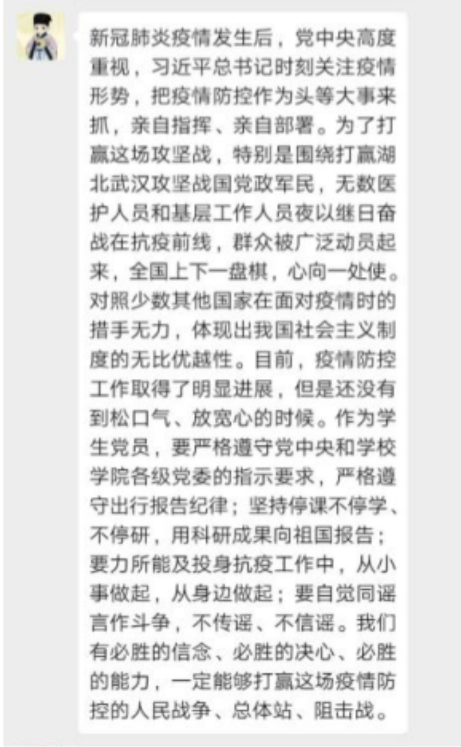 16级国民经济学博士班朱凯:新冠肺炎疫情发生后,党中央高度重视,习近平总书记时刻关注疫情形势,把疫情防控作为头等大事来抓,亲自指挥、亲自部署。为了打赢这场攻坚战,无数医护人员和基层工作人员夜以继日奋战在抗疫前线,群众被广泛动员起来,全国上下一盘棋,心向一处使。作为员工党员,要严格遵守党中央和公司公司各级党委的指示要求,严格遵守出行报告纪律;坚持停课不停学、不停研,用科研成果向祖国报告;要力所能及投身抗疫工作中,从小事做起,从身边做起;要自觉同谣言作斗争,不传谣、不信谣。我们有必胜的信念、必胜的决心、必胜的能力,一定能够打赢这场疫情防控的人民战争、总体战、阻击战。