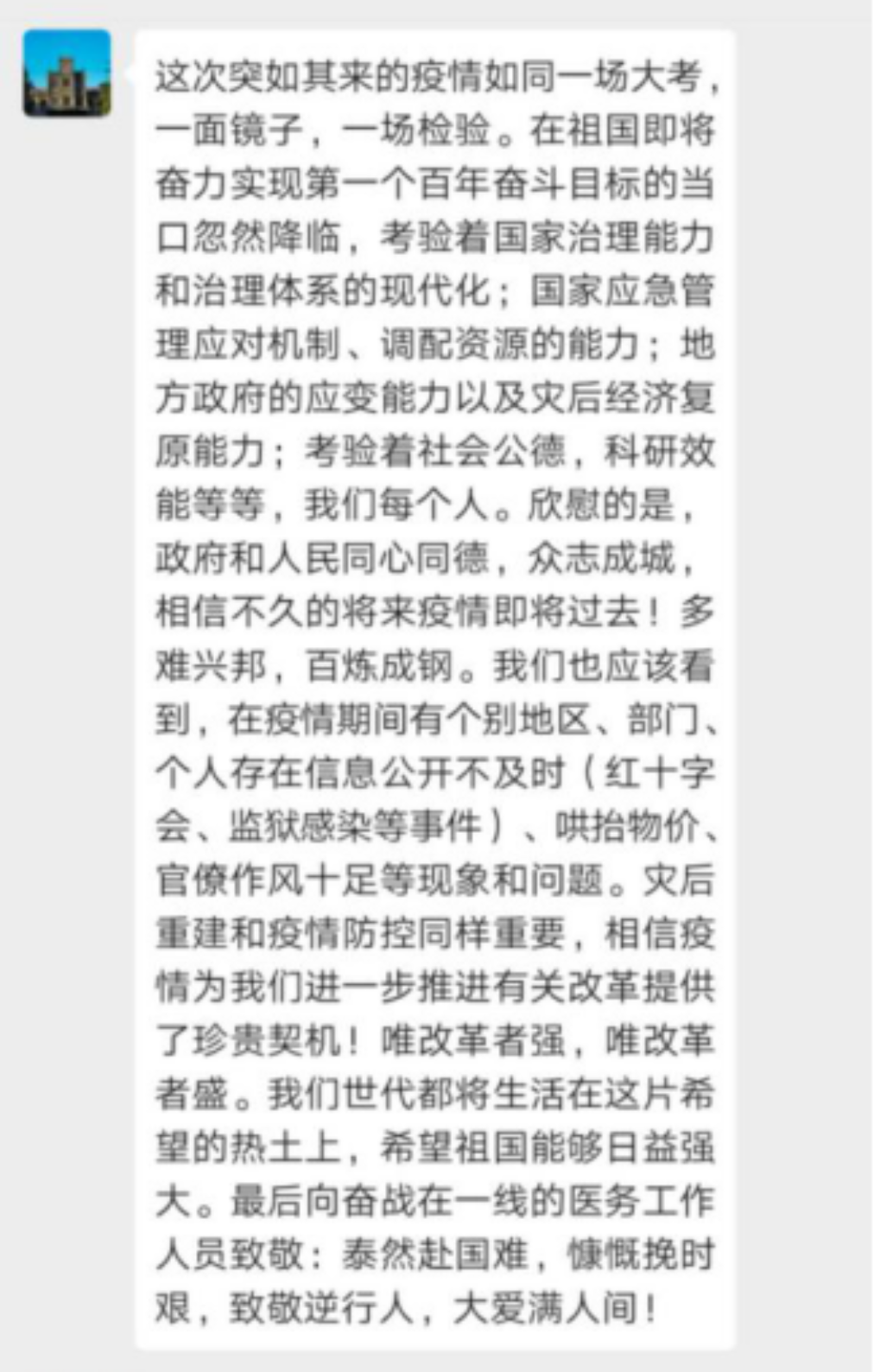 19级国民经济学博士班李震:这次突如其来的疫情如同一场大考,一面镜子,一场检验。在祖国即将奋力实现第一个百年奋斗目标的当口忽然降临,考验着国家治理能力和治理体系的现代化、国家应急管理应对机制、调配资源的能力、地方政府的应变能力以及灾后经济复原能力、考验着社会公德,科研效能等等。欣慰的是,政府和人民同心同德,众志成城,相信不久的将来疫情即将过去!多难兴邦,百炼成钢!我们世代都将生活在这片希望的热土上,希望祖国能够日益强大。最后向奋战在一线的医务工作人员致敬:泰然赴国难,慷慨挽时艰,致敬逆行人,大爱满人间!