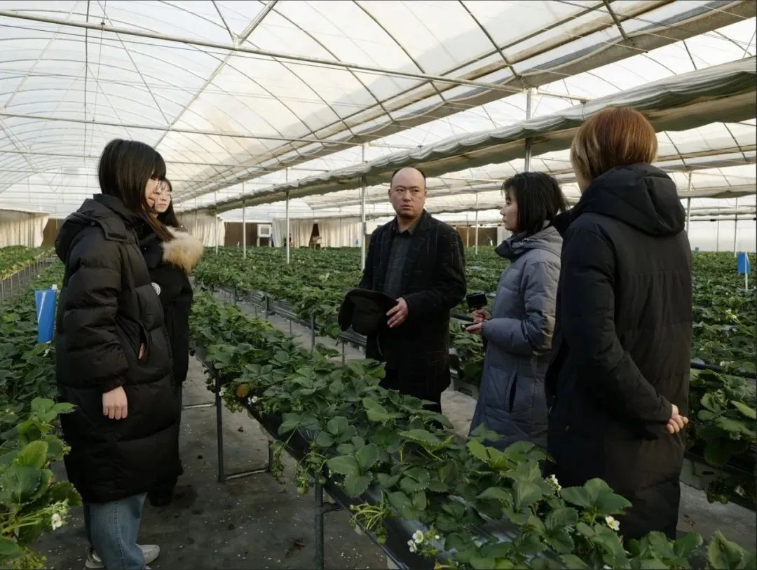 ▲团队参观马树镇智慧农业空中草莓采摘园