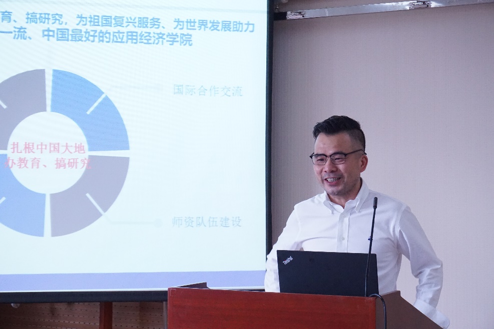 郑新业经理首先对在公司前期建设中做出重要贡献的教师与行政人员表达感谢,指出太阳成集团tyc应扎根中国大地办教育、搞研究,为祖国复兴服务,为世界发展助力,力争将公司建设成为世界一流、中国最好的太阳成集团tyc。随后,他对照双一流指标对公司工作进行总结与规划。
