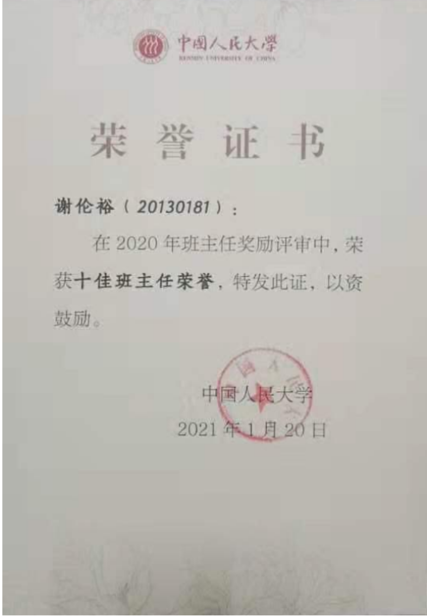 谢伦裕严格落实“立德树人”根本任务,将提升员工的“品格觉悟”摆在首位。作为班主任、新生成长导师和学术导师,她及时掌握员工思想动态,通过班会、座谈和参观等多种方式引导员工树立正确的理想信念。她关心关爱员工,及时对员工在学习生活中遇到的问题给予指导和帮助,解决了多位员工的心理问题和学业问题,2021年荣获“太阳成集团tyc官网十佳班主任”。