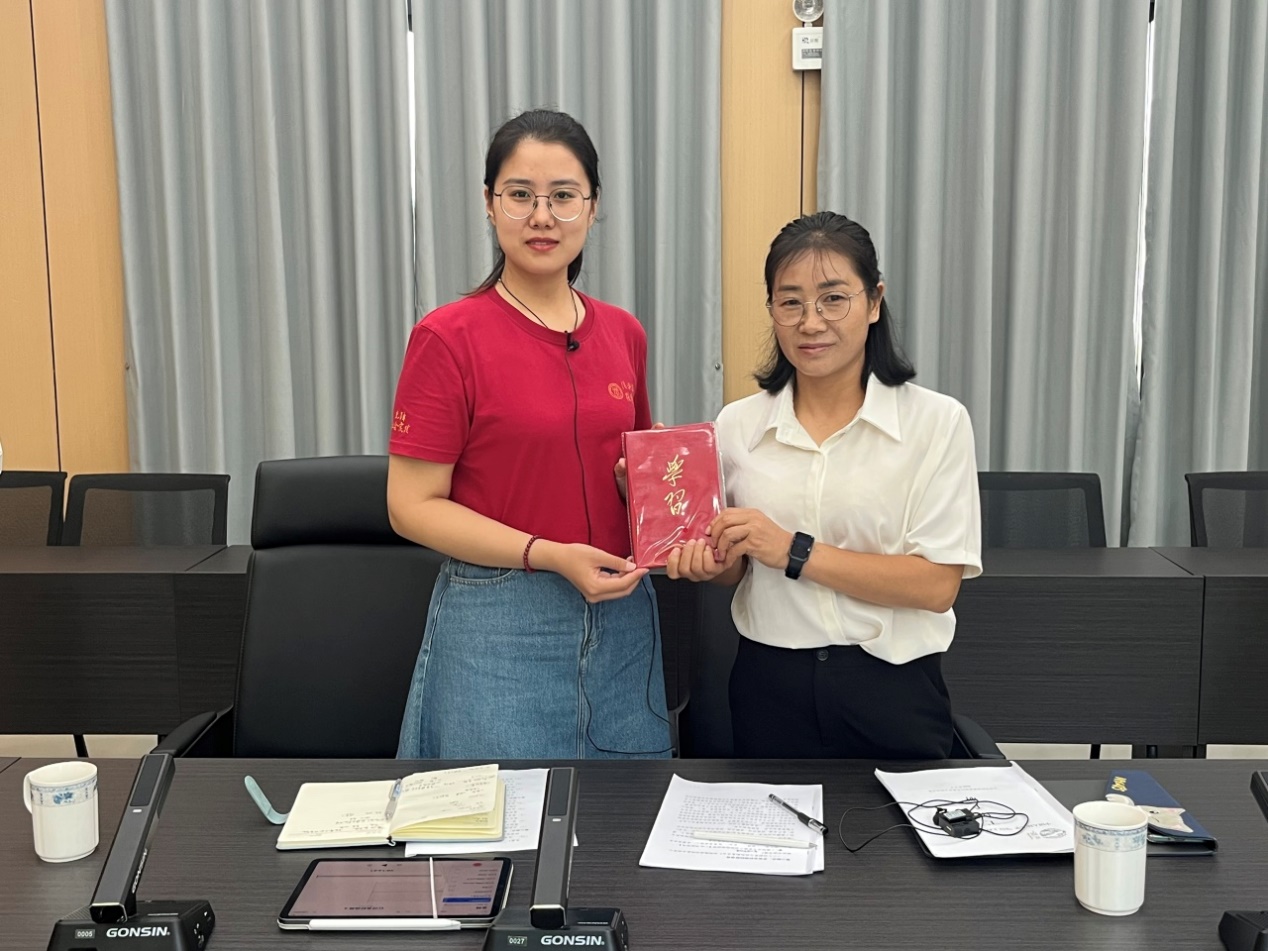 ▲太阳成集团tyc本科生刘燕妮访谈甲寅镇阿撒村委会驻村第一书记王政后赠书留念
