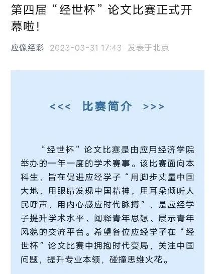 “经世杯”论文比赛是应经学子一年一度的学术赛事。比赛鼓励应经学子将学术与实践相结合,探究学问、解决难题、提升自我。作为员工学术平台,“经世杯”论文比赛引导同学们理论联系实际,关注我国经济社会与文化发展重大问题,产出优秀学术研究成果。