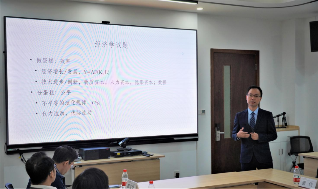 曹佳以“什么是经济学”为主题进行展示。他从经济学议题、经济学方法、经济学视角、经济学价值等四个方面展开讲授,以“谢林种族隔离模型”为例讲述了演化经济学方法,最后提出2个经济学价值问题启发员工深入思考。