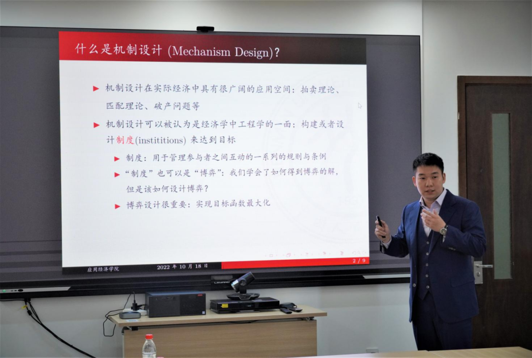 郭伯威以“何为机制设计”为主题进行展示。他以问题为主线,重点讲解了机制设计是什么,与传统的博弈有什么区别,为什么重要。他以两个孩子分蛋糕问题、发电厂建造决策问题为例,详细演示了如何运用机制设计实现社会最优。