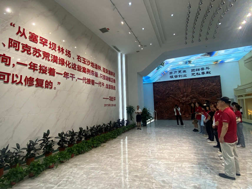 柯柯牙纪念馆共分为荒漠戈壁、百折不挠、薪火相传、信念弥坚四个篇章,以图片、文字、影像等多种形式,全面、立体展示了柯柯牙生态工程的发展历程、伟大成就。30多年廣续奋进,曾经被沙漠覆盖的柯柯牙如今已成为绿色的海洋。森林覆盖率从1980年的3.35%上升到2022年的9.04%,沙尘天气从百余天控制到一个月左右。昔日默默无闻的阿克苏就成为了新疆林果主产区,年产值达数百亿元。如今,450万亩的优质“好果源”,正在不断供应着种类繁多的果品。以冰糖心苹果、纸皮核桃为代表的阿克苏林果产业,成为新疆农业高质量发展的“示范田”。以柯柯牙精神融入血脉的阿克苏人民,在荒漠戈壁上培育出亿万片新叶,改变着大地的颜色,重现绿水青山,又在这绿水青山中开拓奋进,畅享金山银山的喜悦。调研团队成员纷纷感叹,“自力更生、团结奋斗、艰苦创业、无私奉献”的“柯柯牙精神”值得新时代青年学习、传承、弘扬。