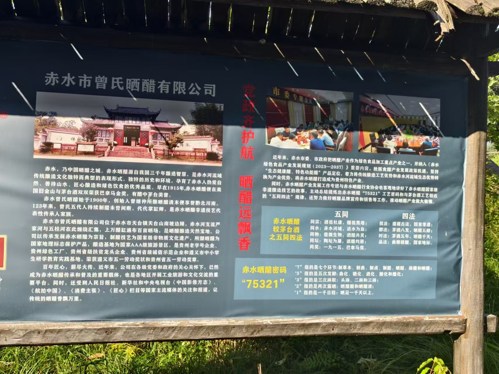 赤水曾氏晒醋有限公司赤水市著名的晒醋企业,专注于传统手工酿造晒醋。公司以传承赤水晒醋历史文化、建设园林式晒醋博物馆、非物质文化遗产传习基地为宗旨,是生产、文化、旅游综合性企业。曾氏晒醋的制作工艺源自明朝,采用传统手工酿造技艺,利用赤水河流域的原料,经过至少三年的日晒夜露酿造而成。其产品色深味浓,酸味适中,口感柔和,具有独特的地方风味和保健功效,被称为“醋中茅台”。