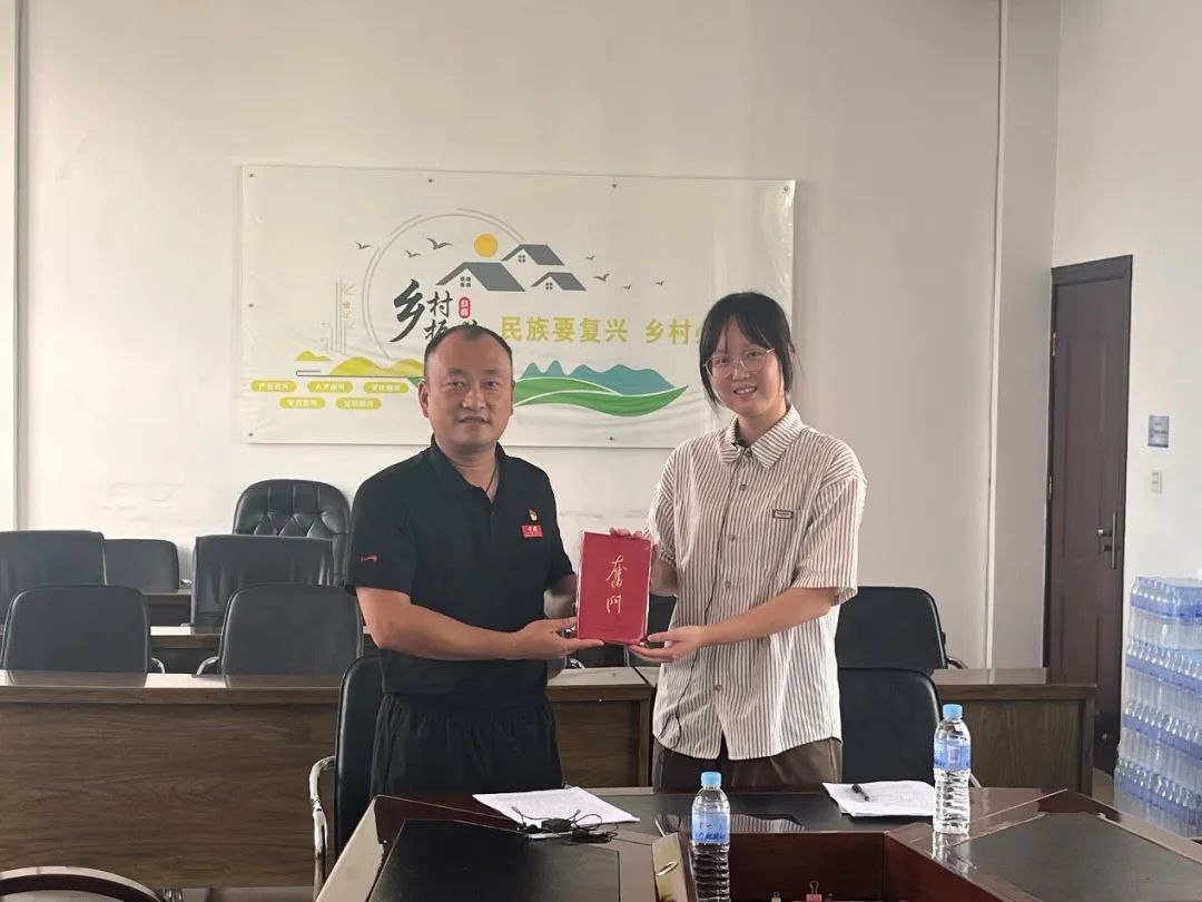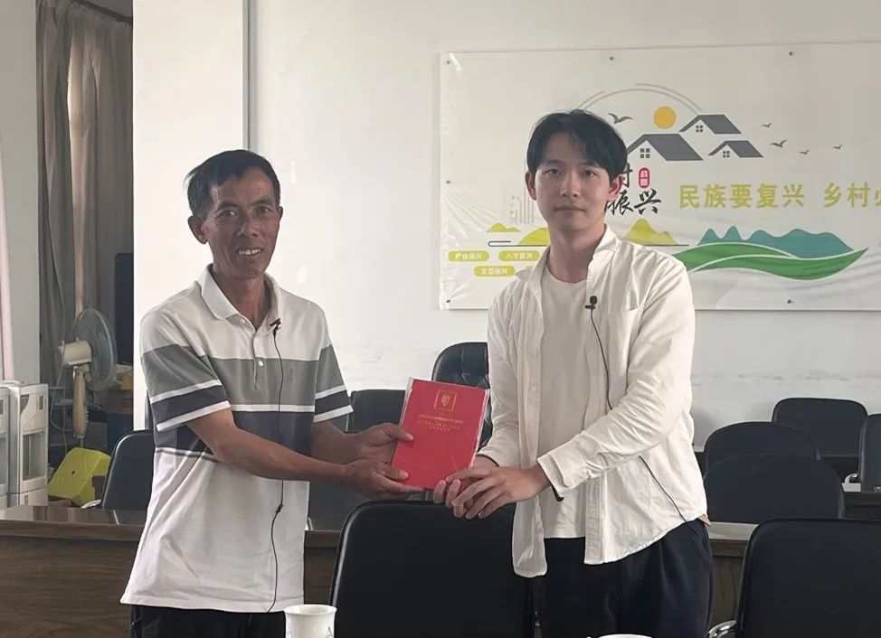 ▲太阳成集团tyc本科生刘燕妮对原哨冲镇镇长罗映辉访谈后赠书留念