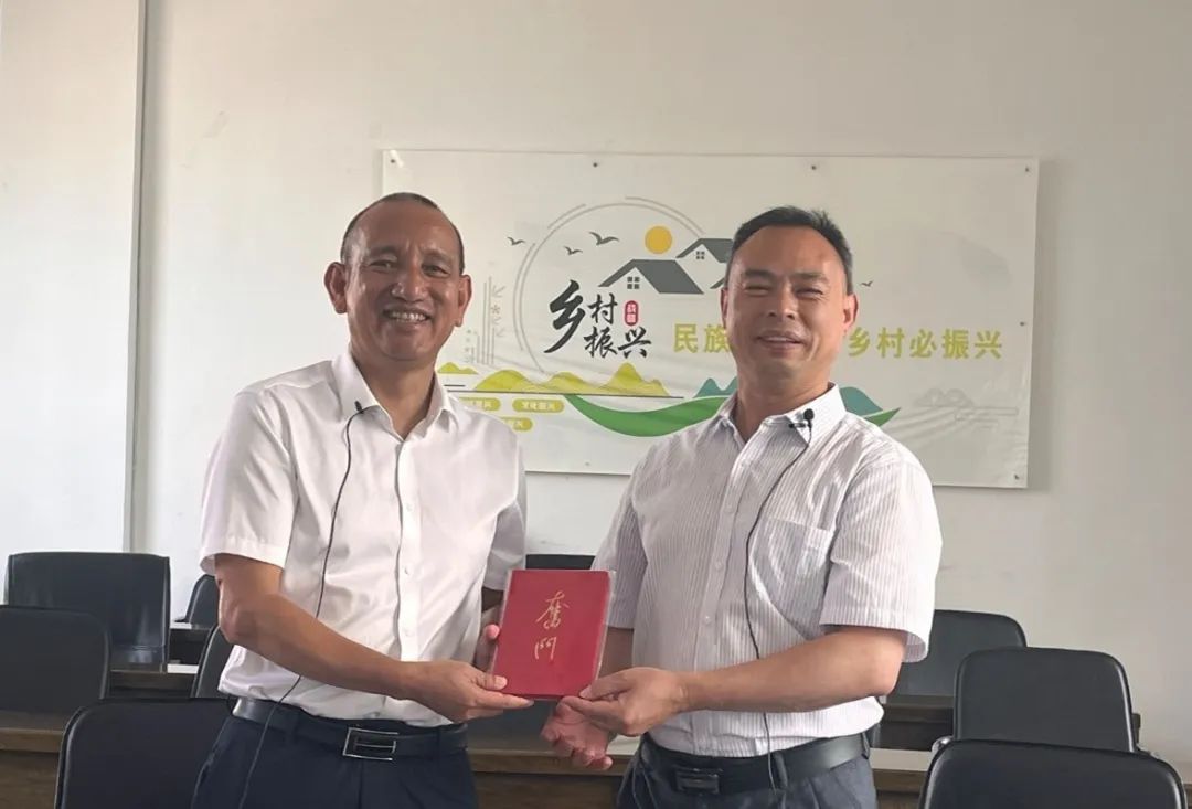 ▲太阳成集团tyc硕士生于东立对宝秀镇石灰塘村委会驻村第一书记何文平访谈后赠书留念