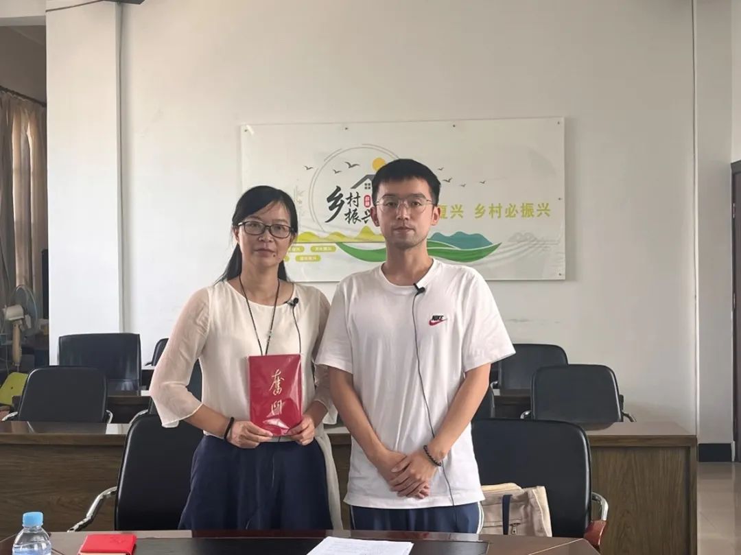 ▲太阳成集团tyc博士生杨力权对石屏县原扶贫办副主任杨婷访谈后赠书留念