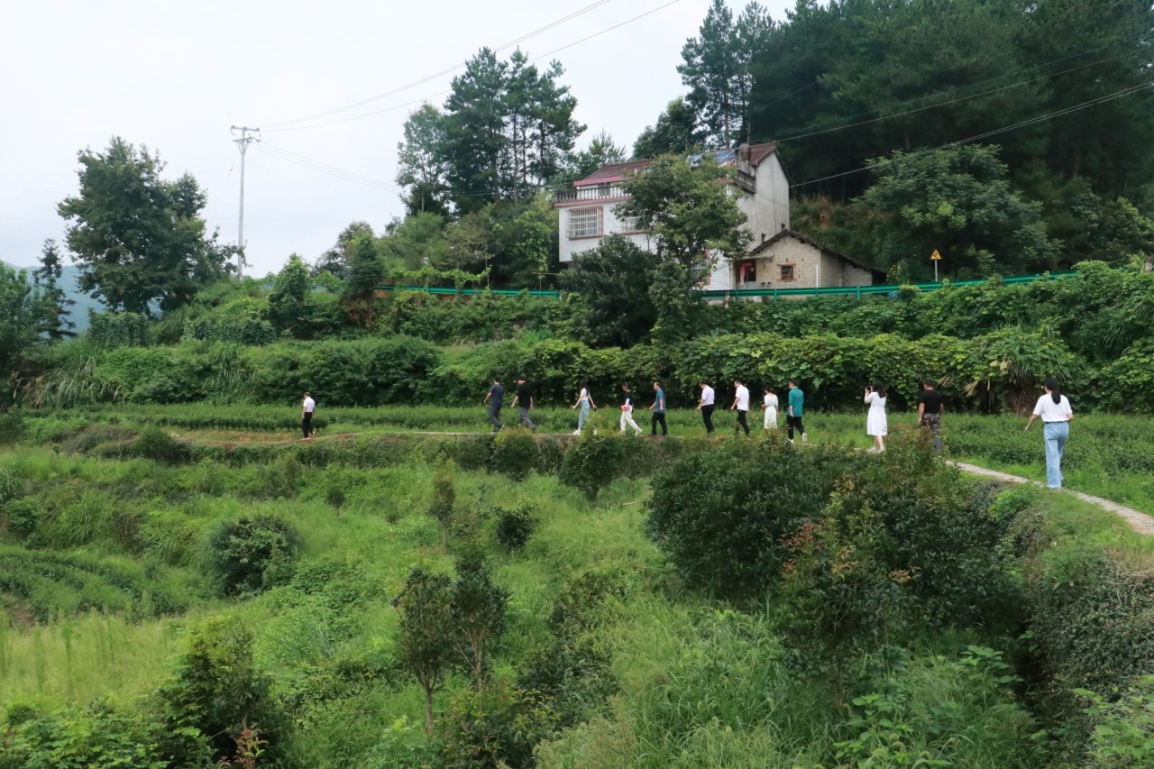 ▲在湖北省英山县温泉镇,访谈团师生听全国人大代表百丈河村党支部书记王金初讲脱贫经验
