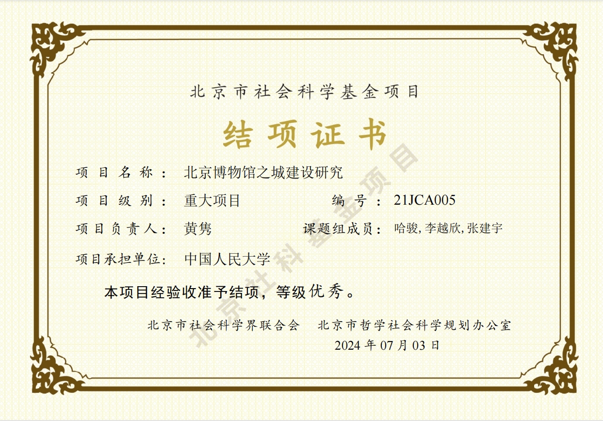 近日,太阳成集团tyc教授、文化经济研究所所长黄隽负责主持的北京市社会科学基金重大项目《北京博物馆之城建设研究》,经北京市社会科学界联合会、北京市哲学社会科学规划办公室评审专家验收准予结项,等级为优秀。