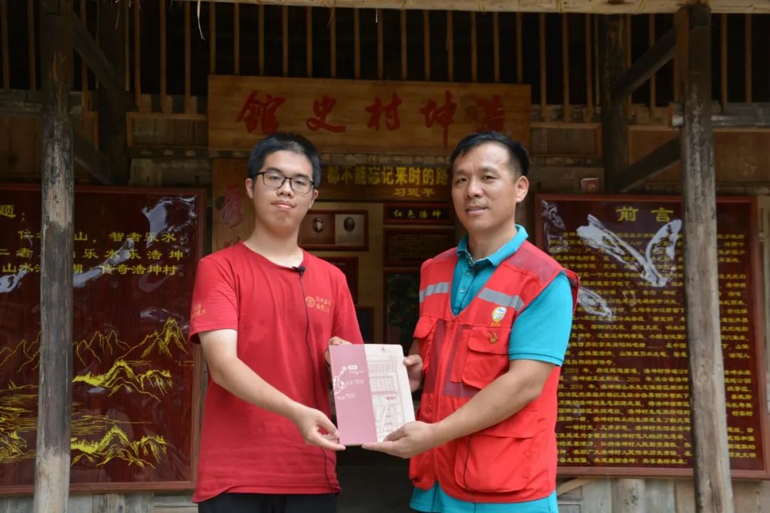▲梁振宇同学向浩坤村第一书记李万华赠送纪念品