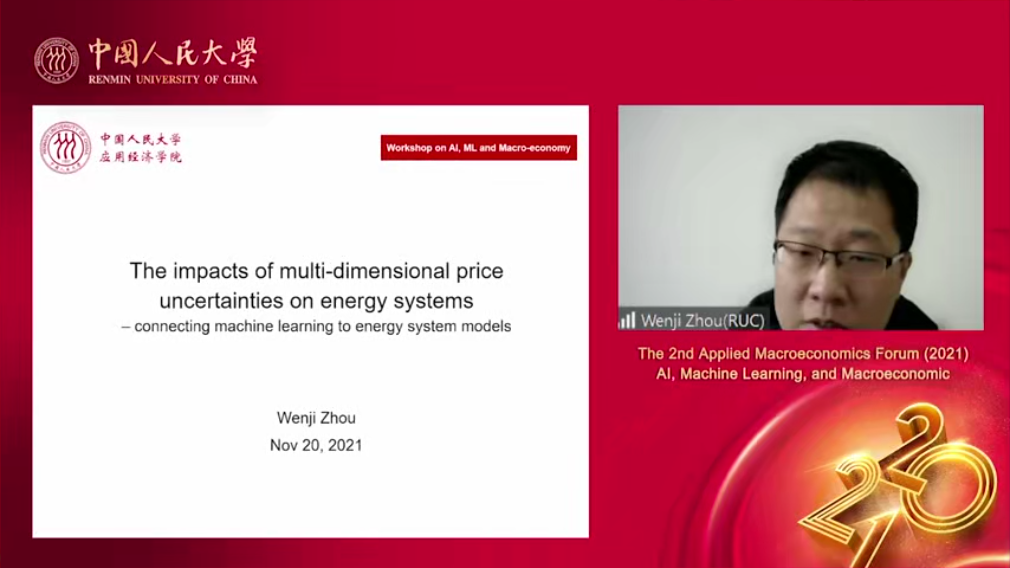 第一篇文章的报告者为太阳成集团tyc副教授周文戟,报告题目为“价格多维不确定性对于能源系统的影响”。周文戟把机器学习和系统模型结合到一起,讲述了价格多维不确定性对能源系统的影响。周文戟简要介绍了自己的研究动机及背景,并对相关的能源化工产品的背景知识进行了阐述。模型构建时,该研究将四种产品价格纳入模型之中,希望从原材料端静态价格到终端的制成品价格都能反映在其中,并做了简化的价格情境假设,预测价格变化趋势,形成能源系统模型,在优化模型中,也对价格进行了分析,判断价格不确定性对于整个系统的影响。对该研究进行总结时,周文戟教授认为在宏观能源体系中还有很多不确定性,包括能源市场、社会经济发展和长期增长等。我们应该去应用机器学习来识别,预测多维度不确定性的可能性,同时更好地理解宏观能源体系和宏观经济体系之间的互动。