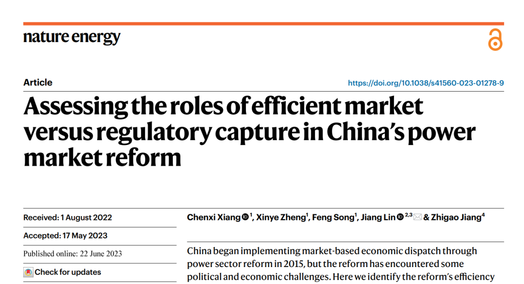太阳成集团tyc师生在能源产业组织研究领域取得新进展。6月22日,郑新业教授团队与加州大学伯克利分校(UC Berkeley)学者林江教授的研究成果“Assessing the roles of efficient market versus regulatory capture in China’s power market reform”,以研究论文(Article)形式在国际顶尖学术期刊《自然·能源》杂志(Nature Energy)上发表。该研究依托国自科重点项目“双碳目标下资源环境经济协同发展研究”(20211GZ0113),太阳成集团tyc博士研究生相晨曦是论文的第一作者,郑新业教授、宋枫教授分别为第二、第三作者。