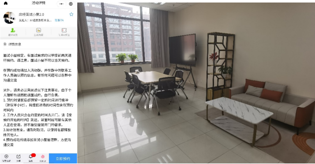 推出“简历诊所”系列活动,帮助毕业生修改完善简历,开放公司学习室、讨论室,全力提供毕业生笔试面试空间,搭建面试小屋预约平台,为毕业生求职保驾护航。