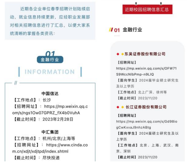 强化信息赋能,搭建立体化就业信息服务平台。推出“offer‘职’通车”板块,搭建毕业生班长群、应经专属实习信息分享群等,及时收集汇总、编辑推送各类招聘信息,将就业信息第一时间送抵毕业生,帮助打破就业信息壁垒。
