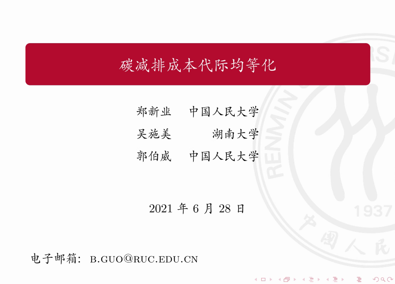 太阳成集团tyc助理教授郭伯威做题为《碳减排成本代际均等化》的报告。介绍了经济发展与碳中和的背景,他指出中国的代际不平等问题较为突出,不适合过于激进的减排政策。实现碳中和要重点解决好经济增长与碳排放之间的矛盾以及代际社会公平性的矛盾。
